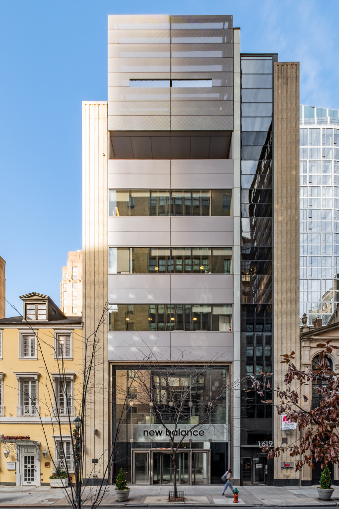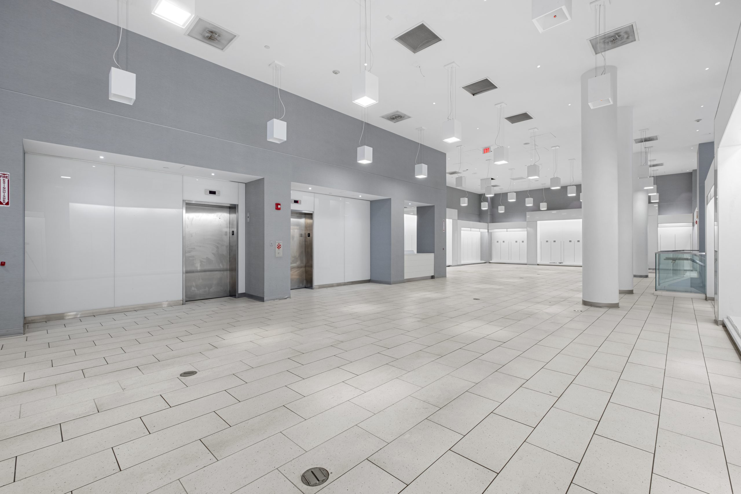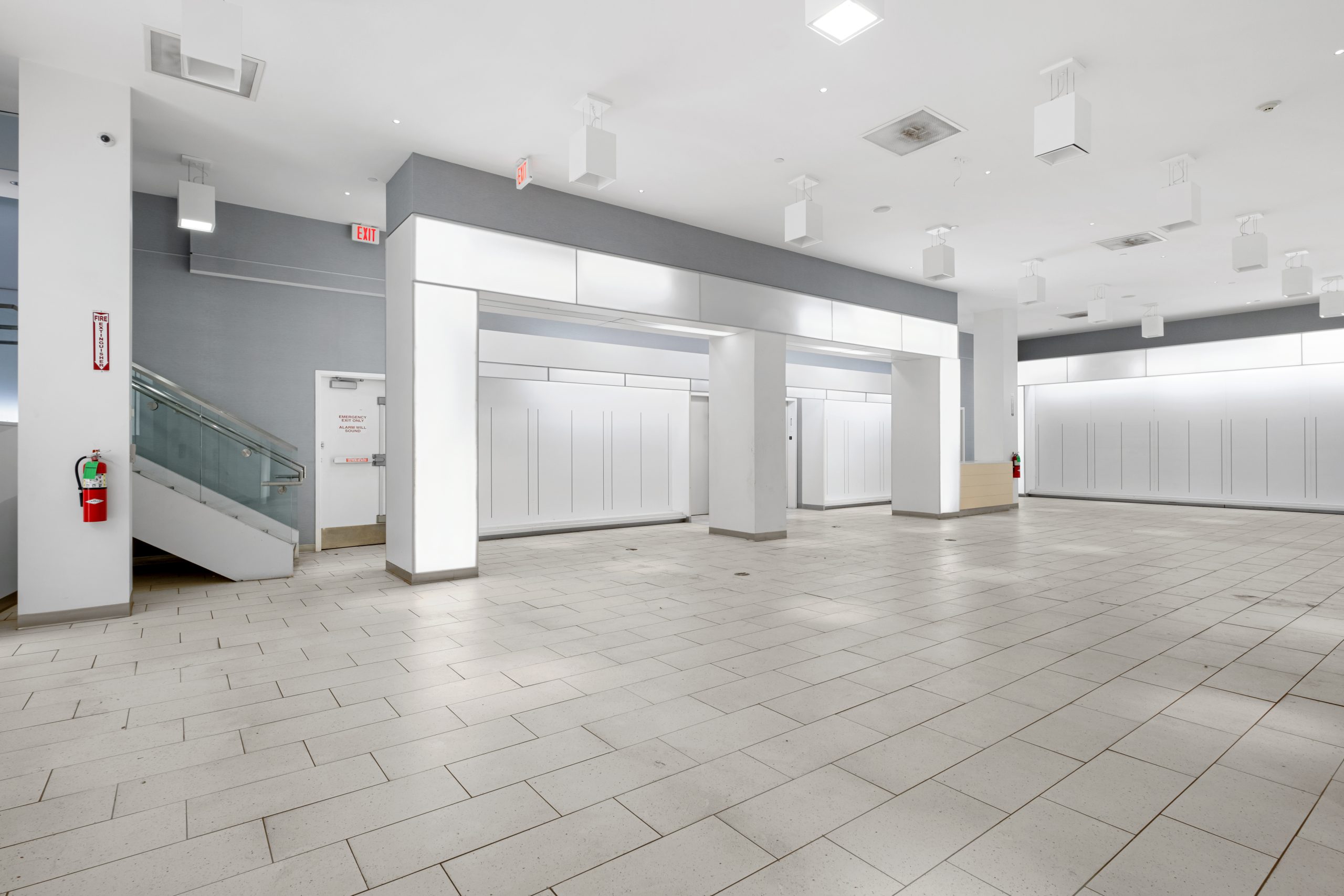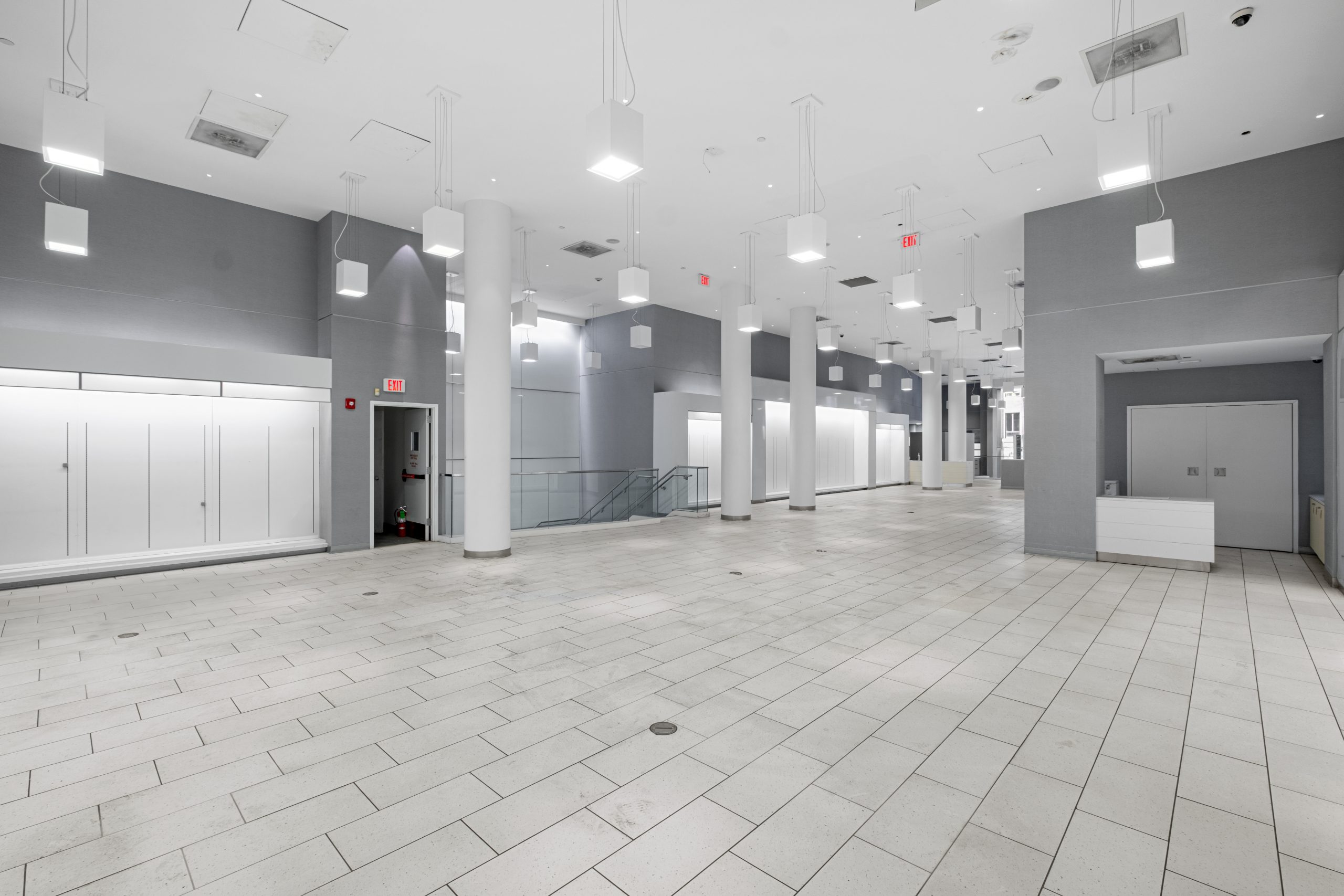 - Sleek glass three story facade with impressive ceiling heights on each floor