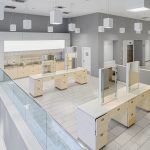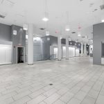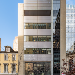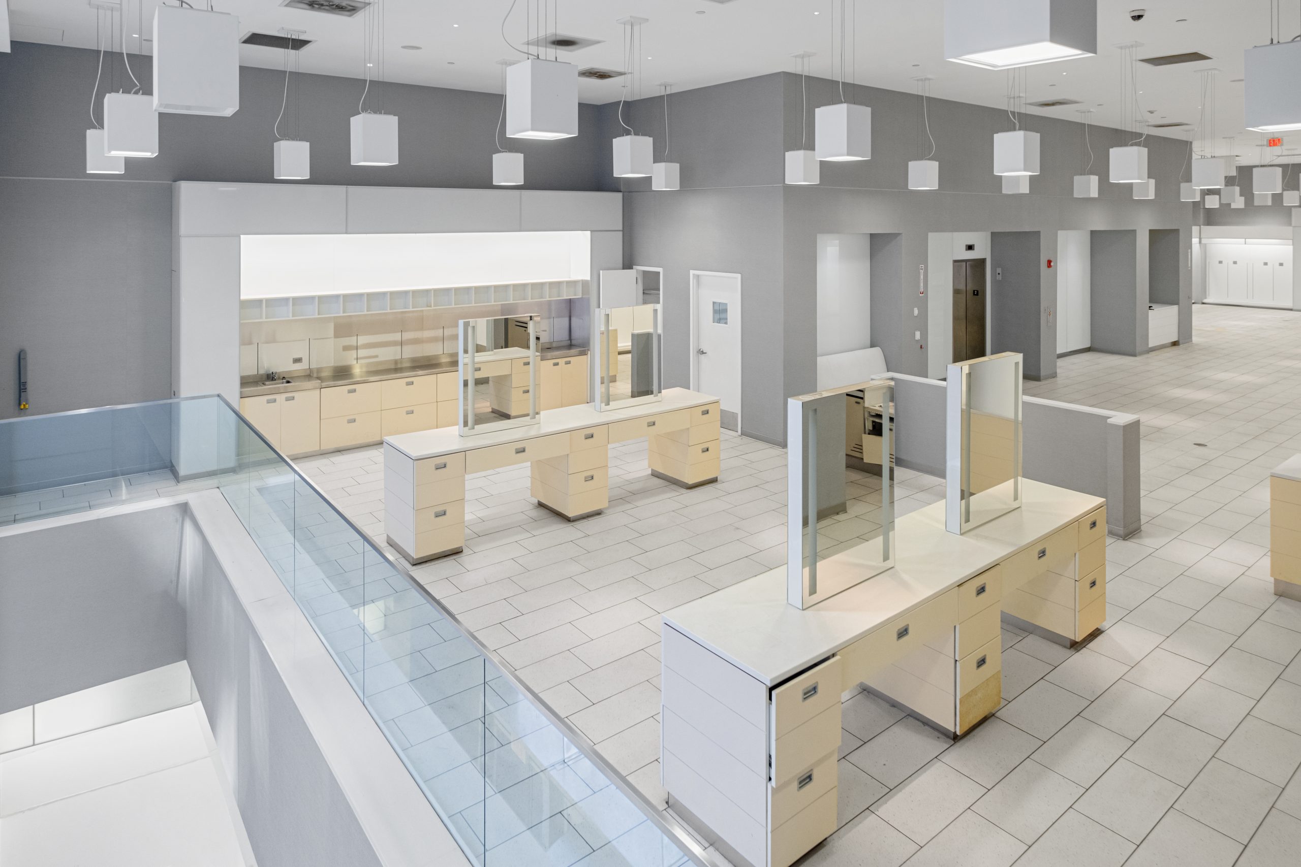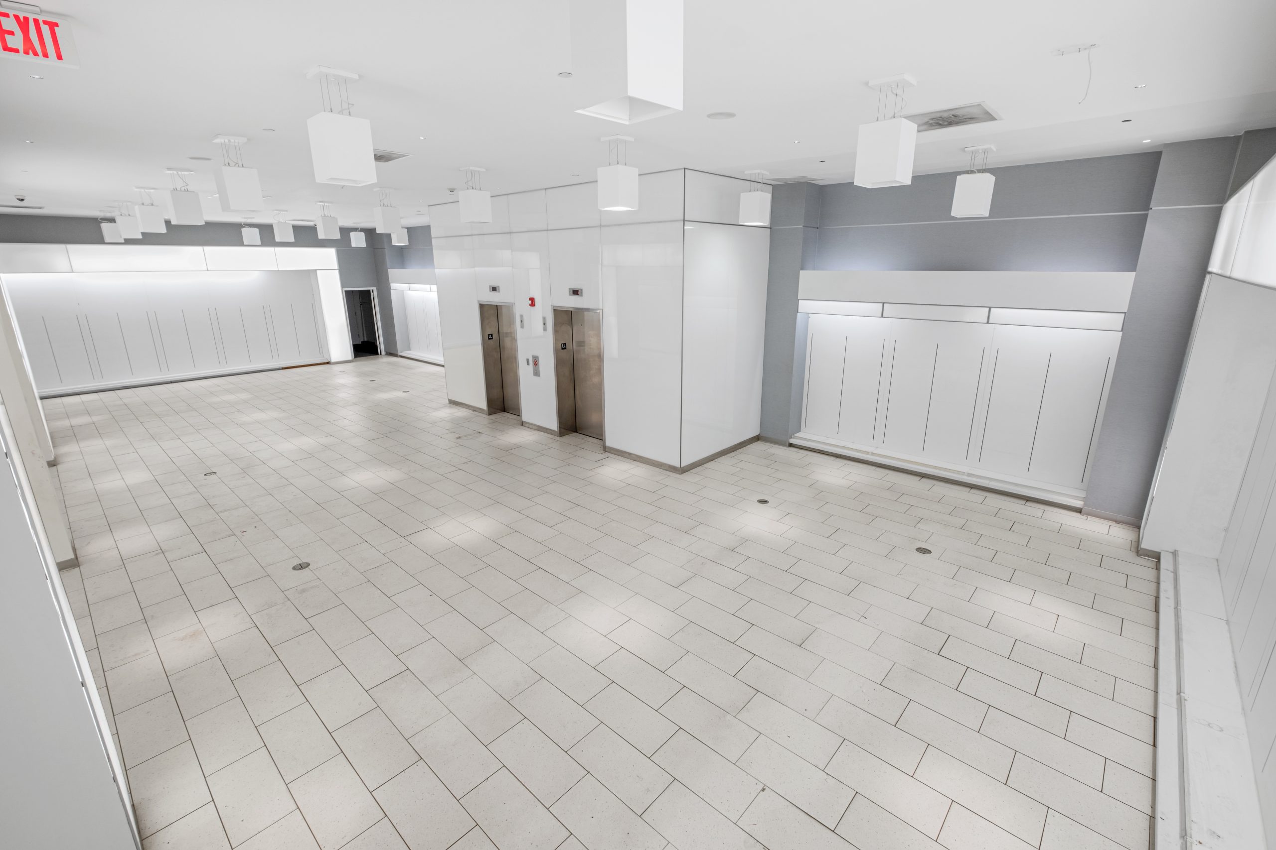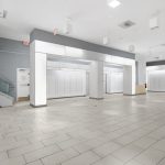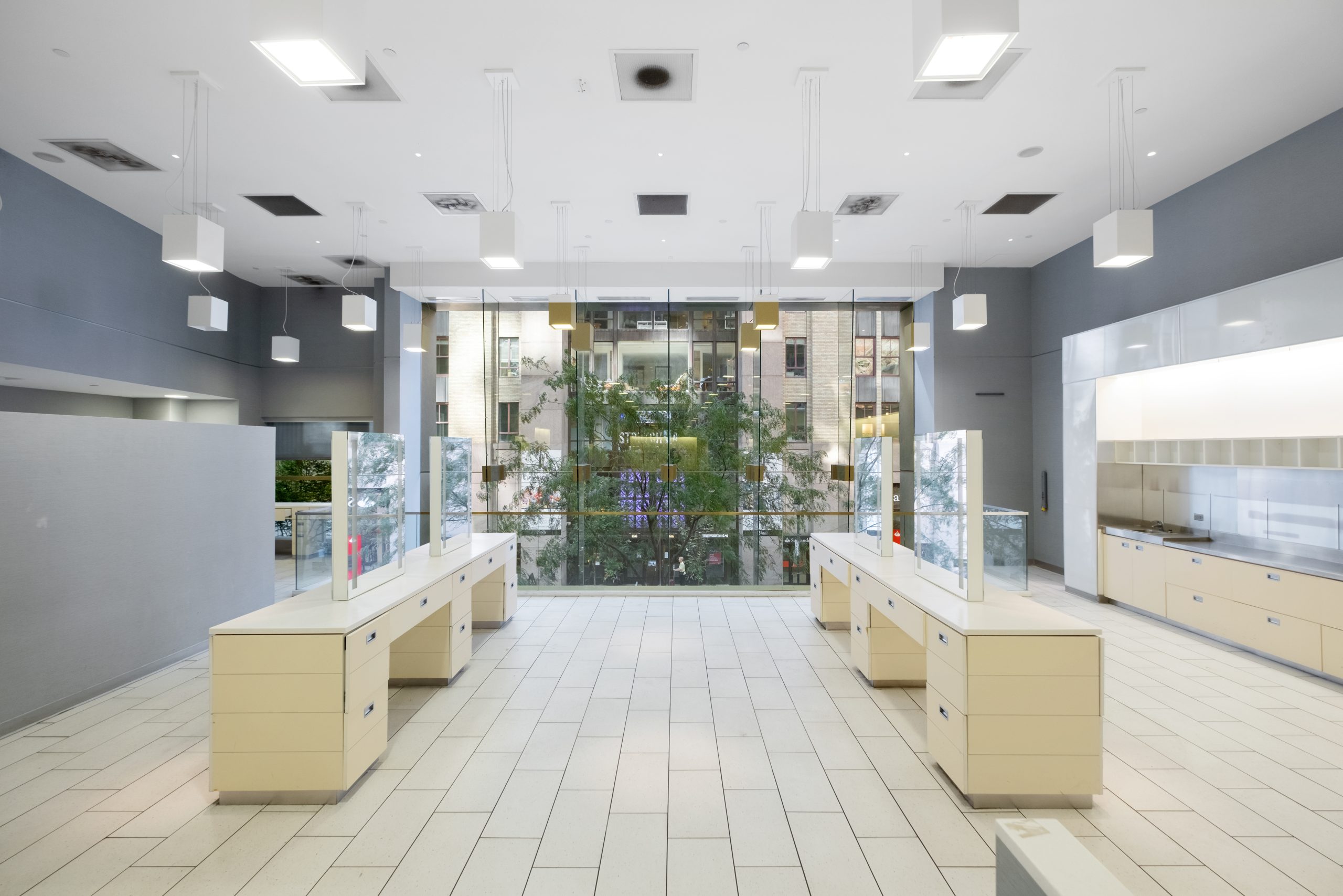 - Sleek glass three story facade with impressive ceiling heights on each floor