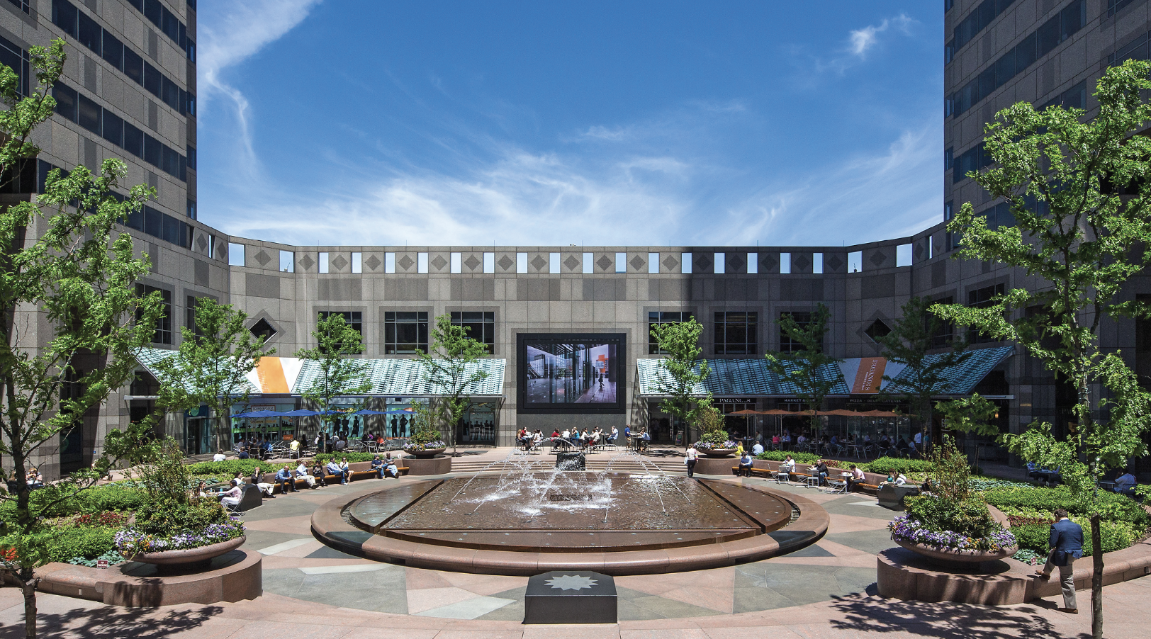 - All retail spaces have frontage and/or access to spectacular courtyard with seating and fountain, maintained and programmed year-round